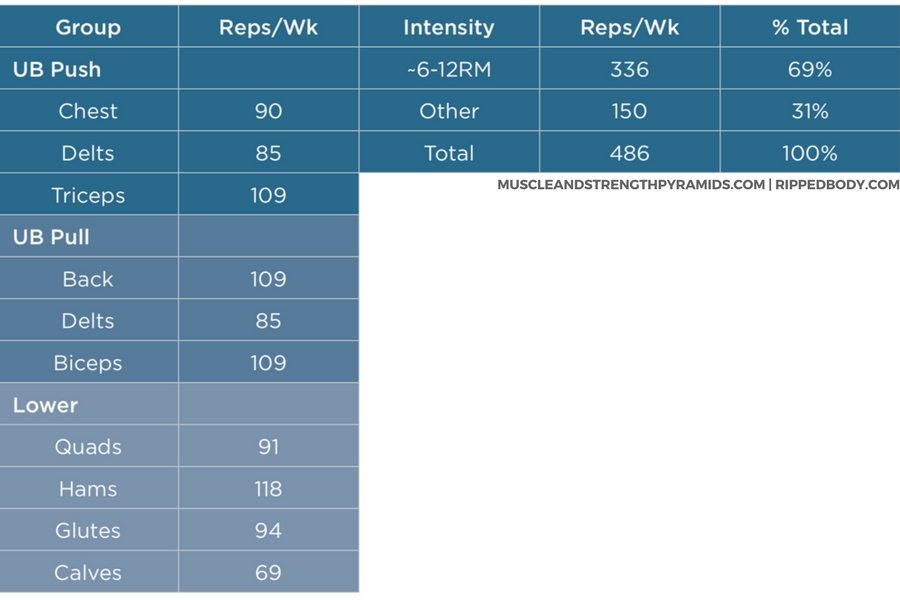 In all of the bodybuilding programs, unlike the powerlifting programs, volume is not only considered in relation to lower-body, and upper-body push and pull, but rather for each specific muscle group within these categories. Thus, they have been designed to ensure complete, symmetrical development over time.